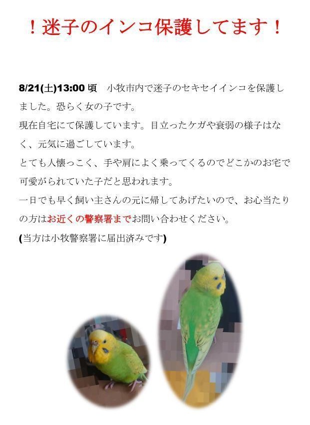 posted 2021年08月22日 8月21日13時頃に小牧市で迷子のセキセイインコを保護した方がいます 8月21日の13時頃に小牧市で迷子になっているセキセイインコを保護した方がいます! 職場のベランダに飛んできたそうです。 そのセキセイインコの姿がこちら↓ すでに警察には届け出済みで、SNSでの情報提供・収集もしているとのことですが、まだ飼い主は見つかっておらず、めぼしい情報は得られていないそうです。 心当たりのある方は、以下のサイトの「投稿者さんへメールを送る」という所から連絡していただけるとありがたいです。 よろしくお願いいたします! 下記の文章は保護した方が書いた呼びかけ文になります。 カテゴリなしの他の記事 タグ :#セキセイインコ#小牧市#迷子 「焼肉五苑 小牧花塚店」で8月21日~9月12日まで肉が半額に!「カフェドブリアン」の『桃のパフェ』(長久手市杁ケ池)