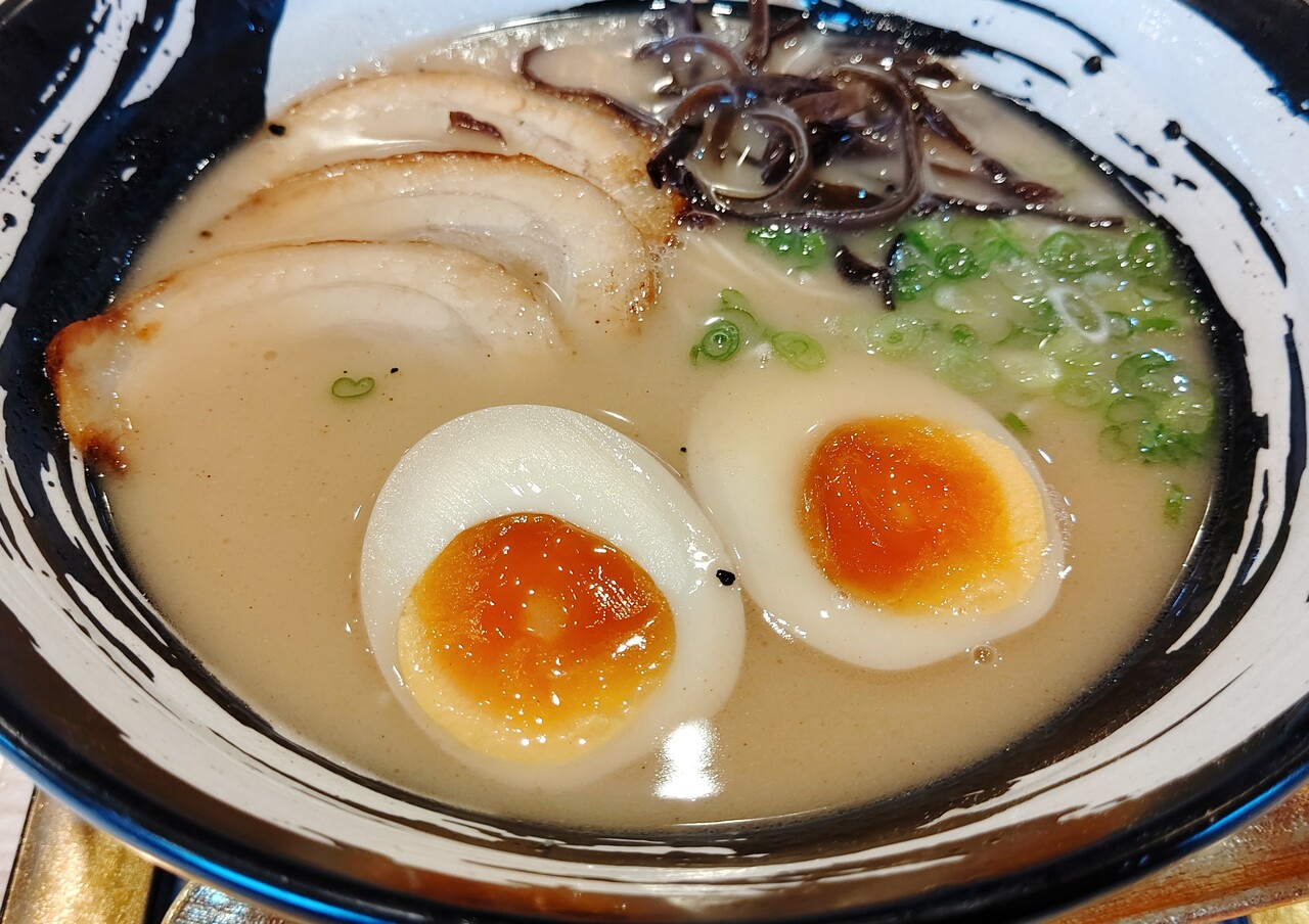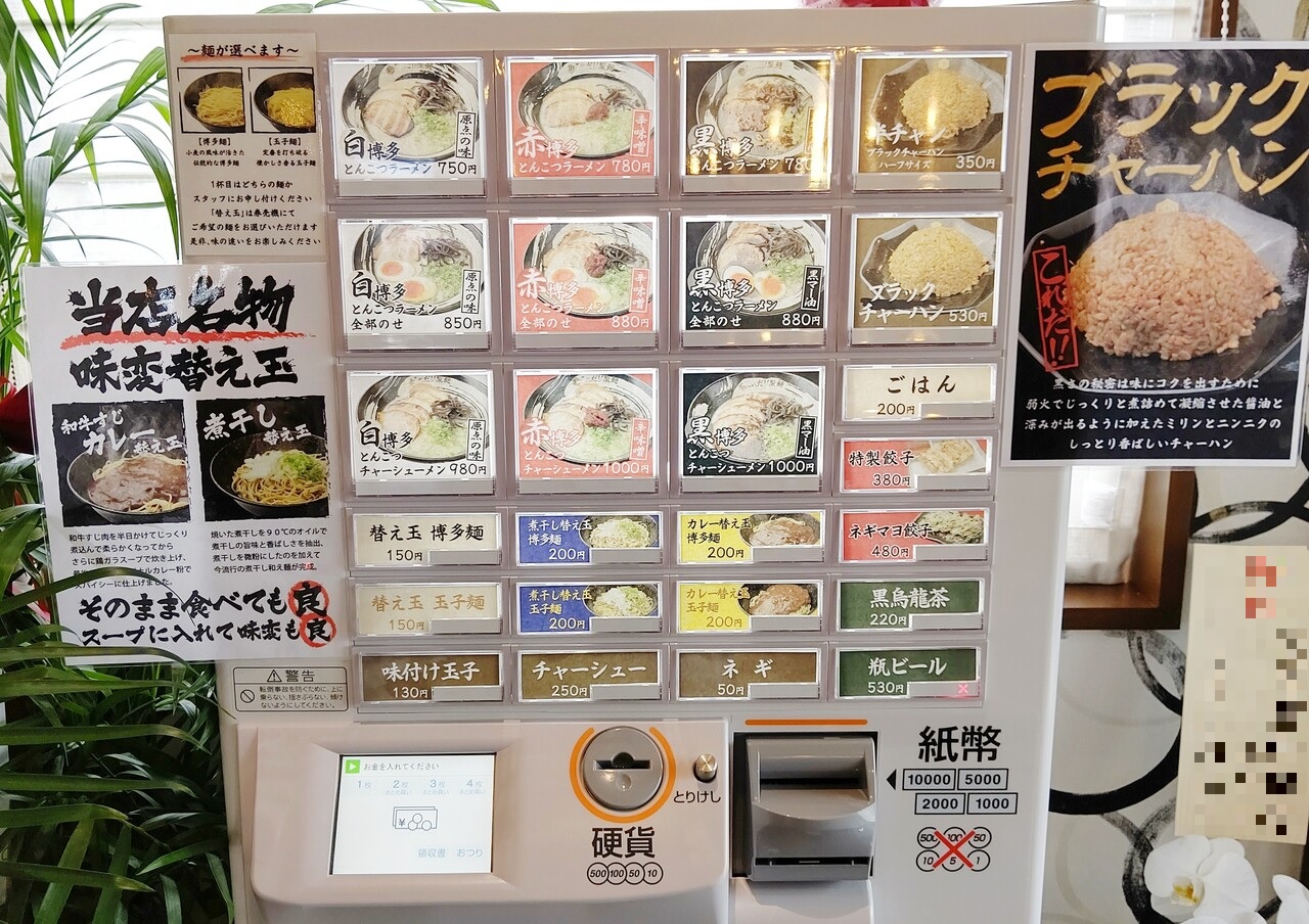 ラーメンは白博多、赤博多、黒博多の3種類。替え玉あります!
