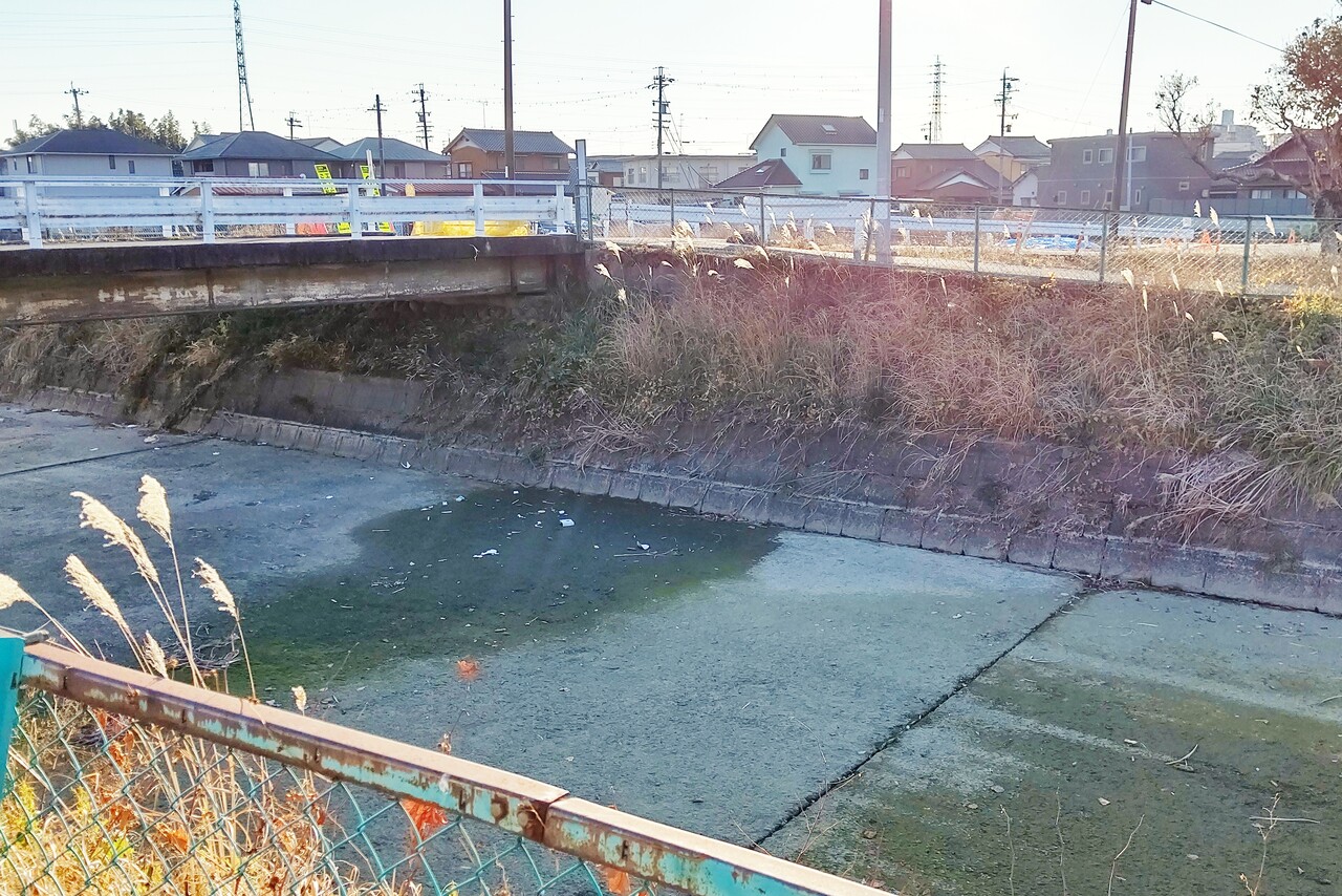 人工ですので、川の底はこのように平坦なコンクリート状態になっています。
