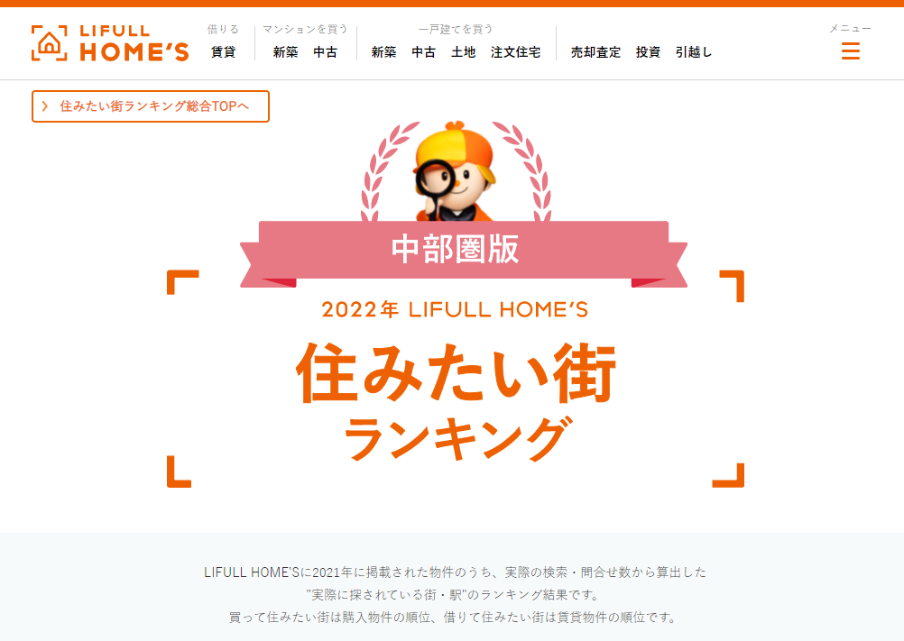 中部圏版 2022年 LIFULL HOME'S『住みたい街ランキング』が出ています。