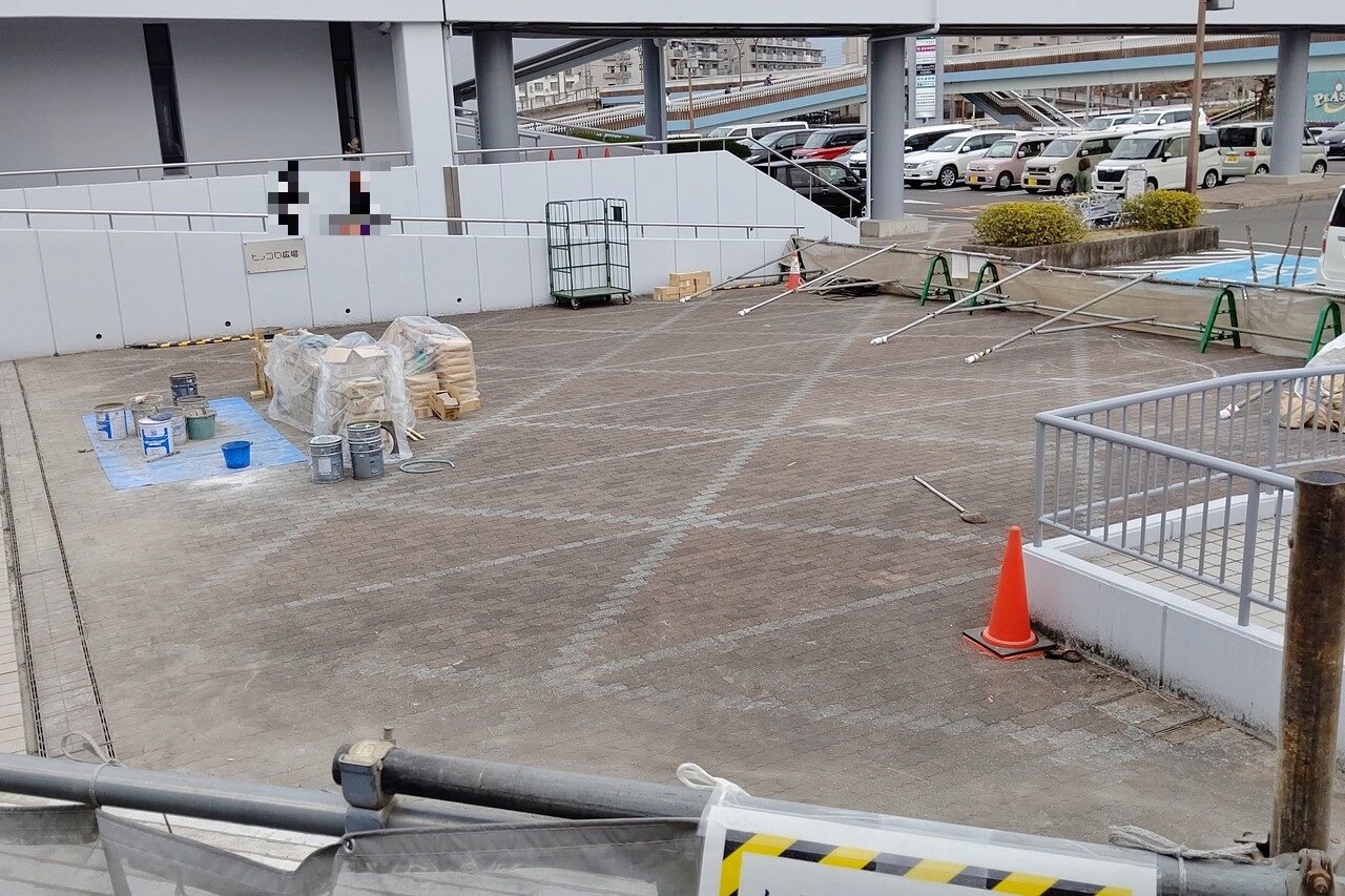 小牧市古雅にあるピアーレ(MEGAドン・キホーテUNY桃花台店)の外にあるピッコロ広場でタイル改修工事が行われています。