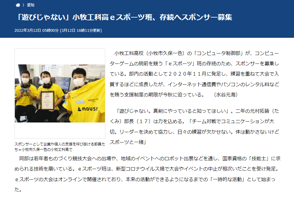 小牧工科高校のeスポーツ班がスポンサーを募集しています。