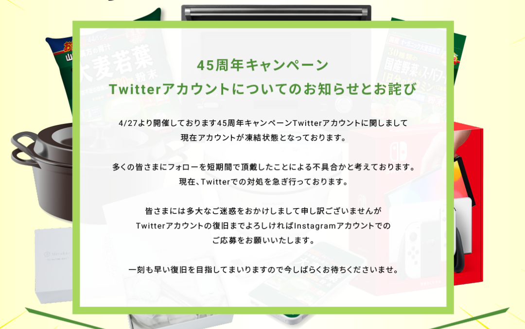 このキャンペーンが始まったことでフォロワーが急激に増えて、Twitterアカウントが凍結されてしまったようです。