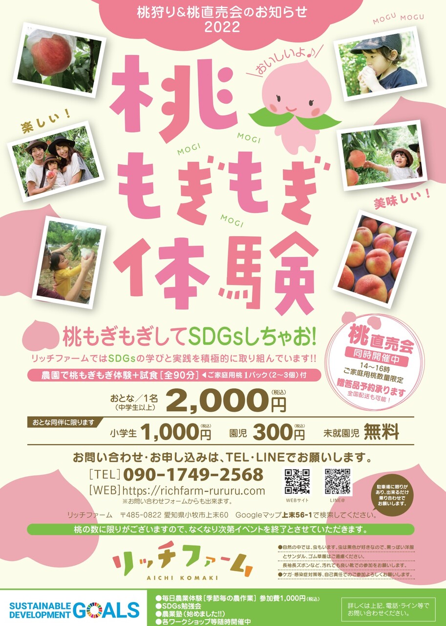 小牧市上末にある「リッチファーム」で桃狩り『桃もぎもぎ体験』の先行予約が始まっています。