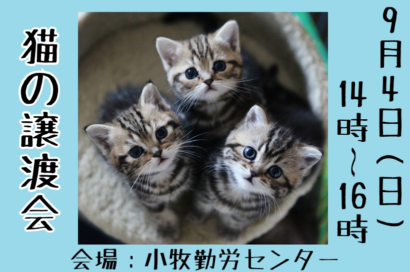 9月4日(日)に小牧勤労センターで『猫の譲渡会』が開催されるようです。