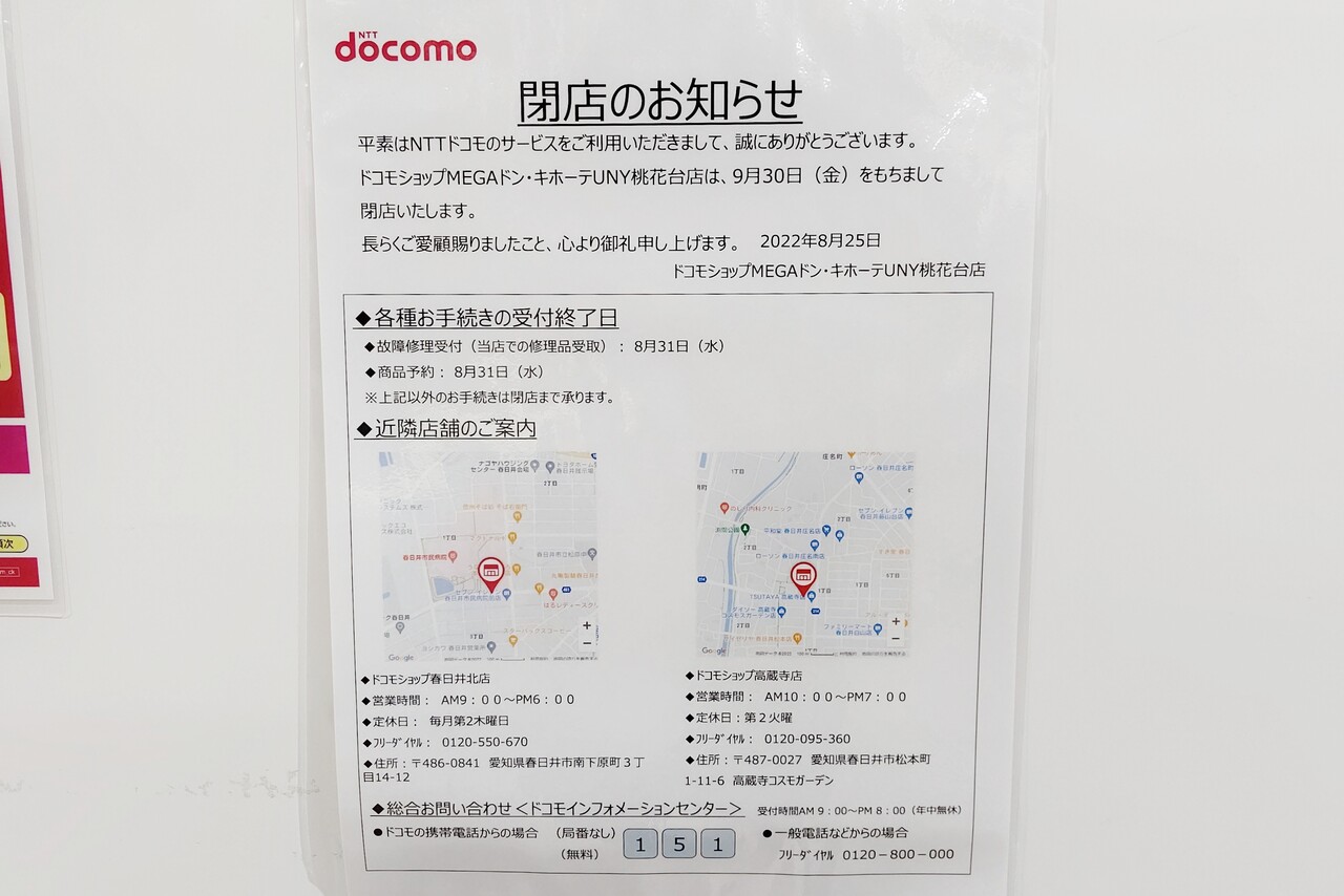 これで小牧市内に3店舗(小牧店、小牧田県店、桃花台店)あったドコモショップは2店舗に。