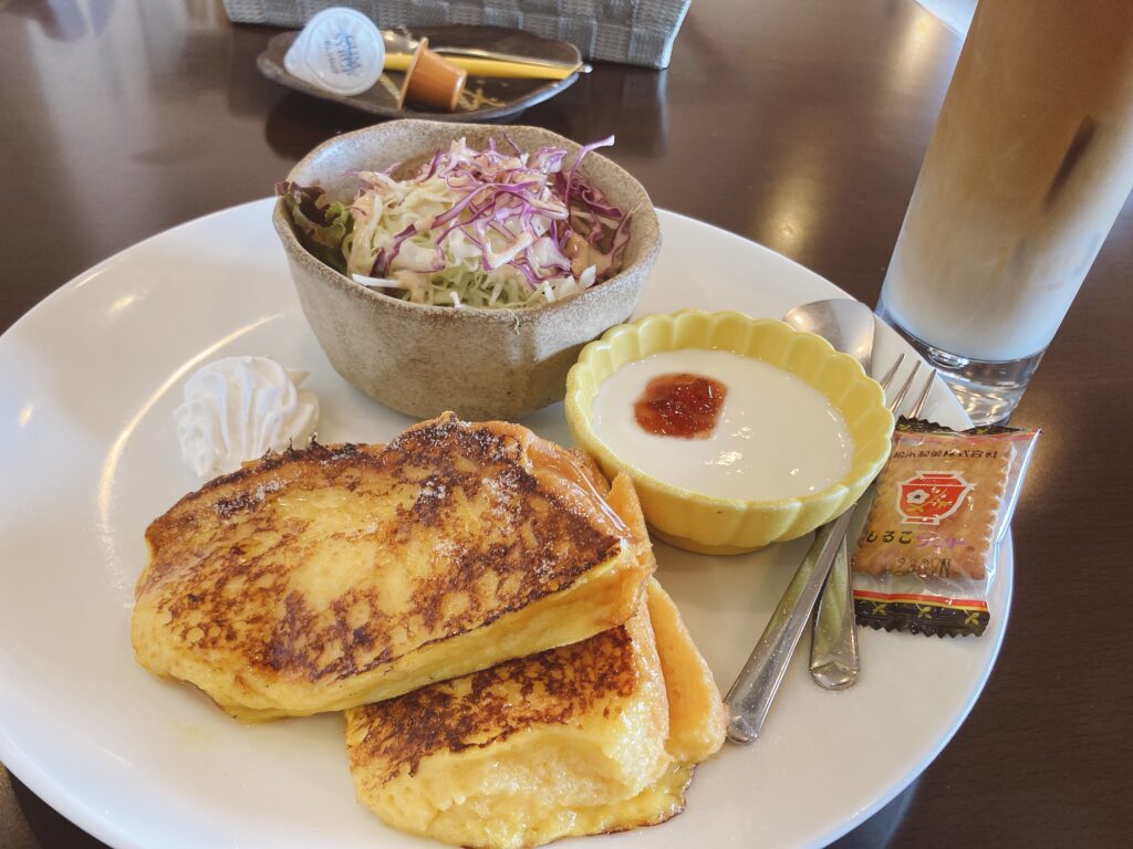 フレンチトーストが2枚と、サラダ、ヨーグルト、しるこサンドまでついていました!