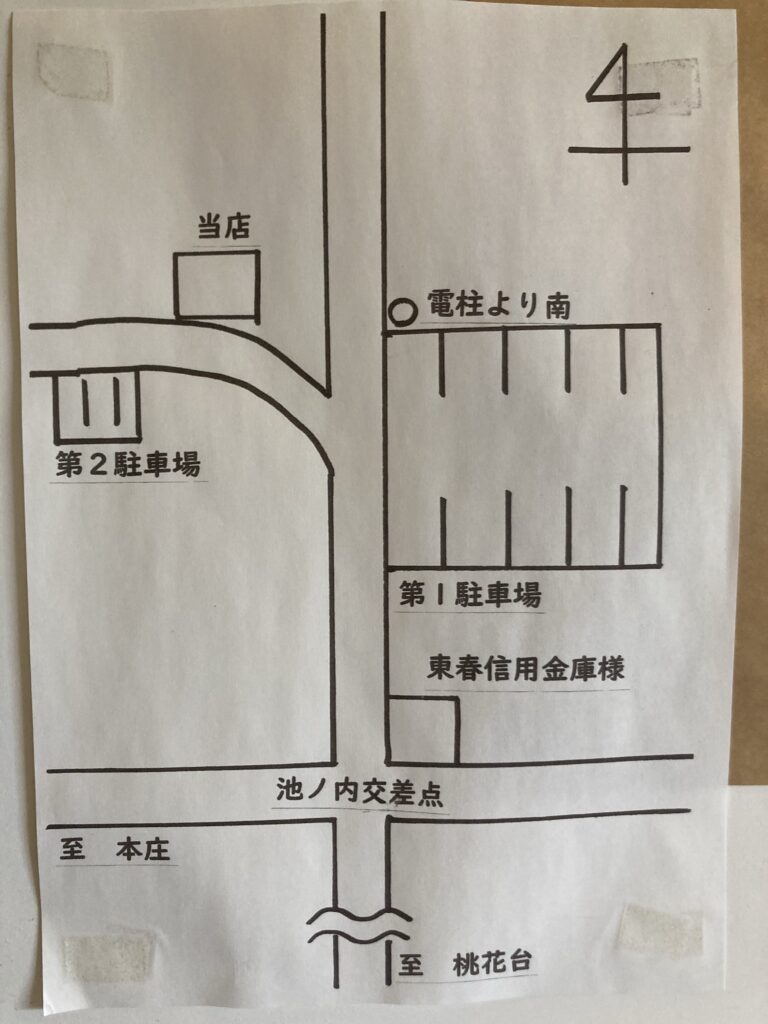 道を挟んだところに第一駐車場、お店を奥に行った所に第二駐車場があります。