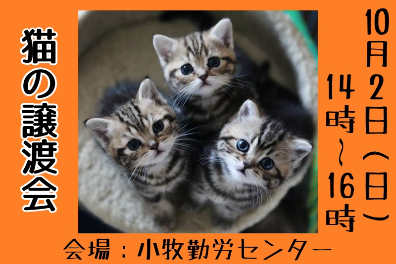 10月2日(日)に小牧勤労センターで『猫の譲渡会』が開催されるようです。