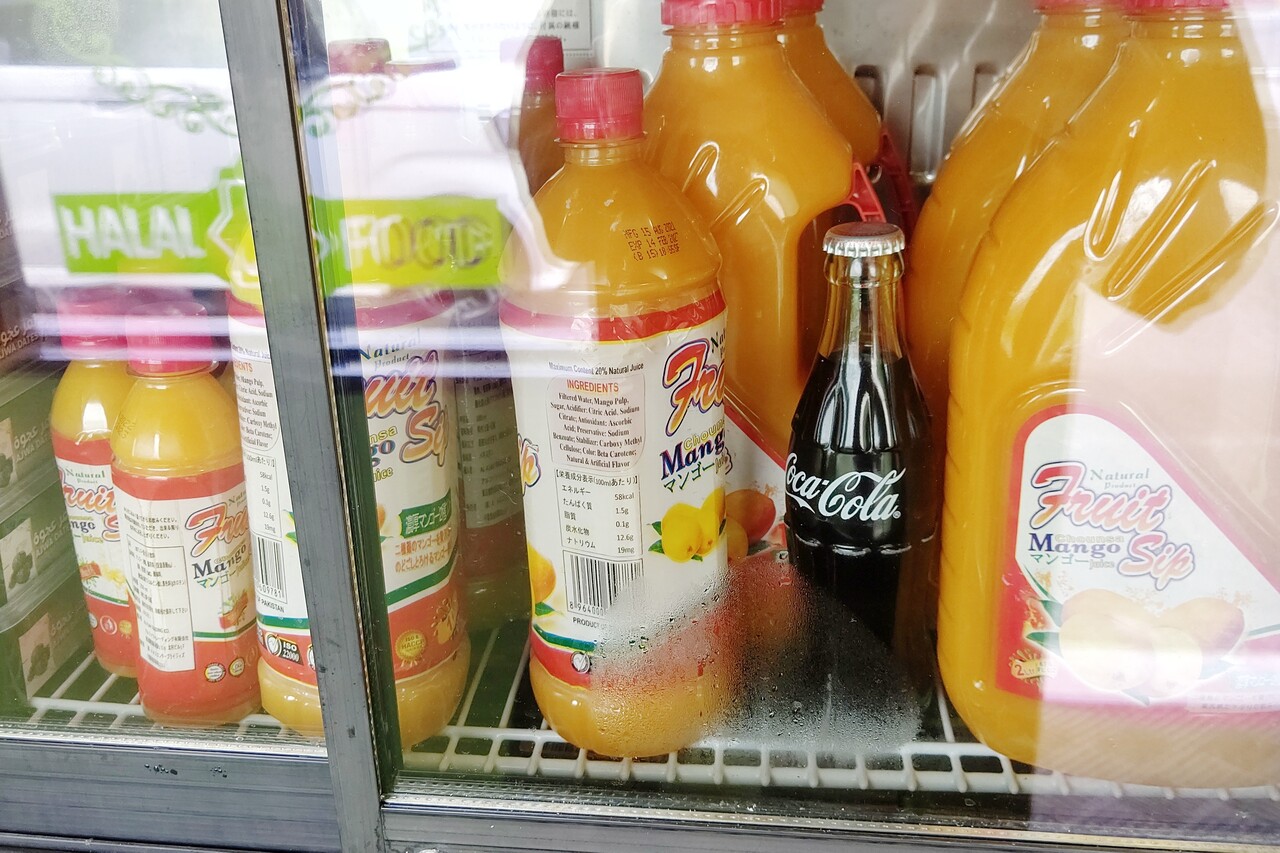 なぜか複数のマンゴージュースの間に1本だけ瓶のコカ・コーラの姿が。笑