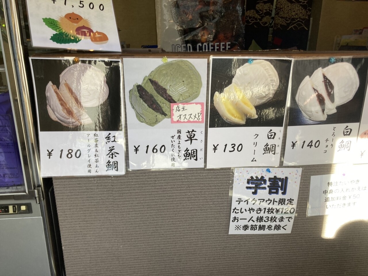 チョコ・カスタード・草鯛焼き・愛鯛焼き(餡子)がレギュラーメニュー。