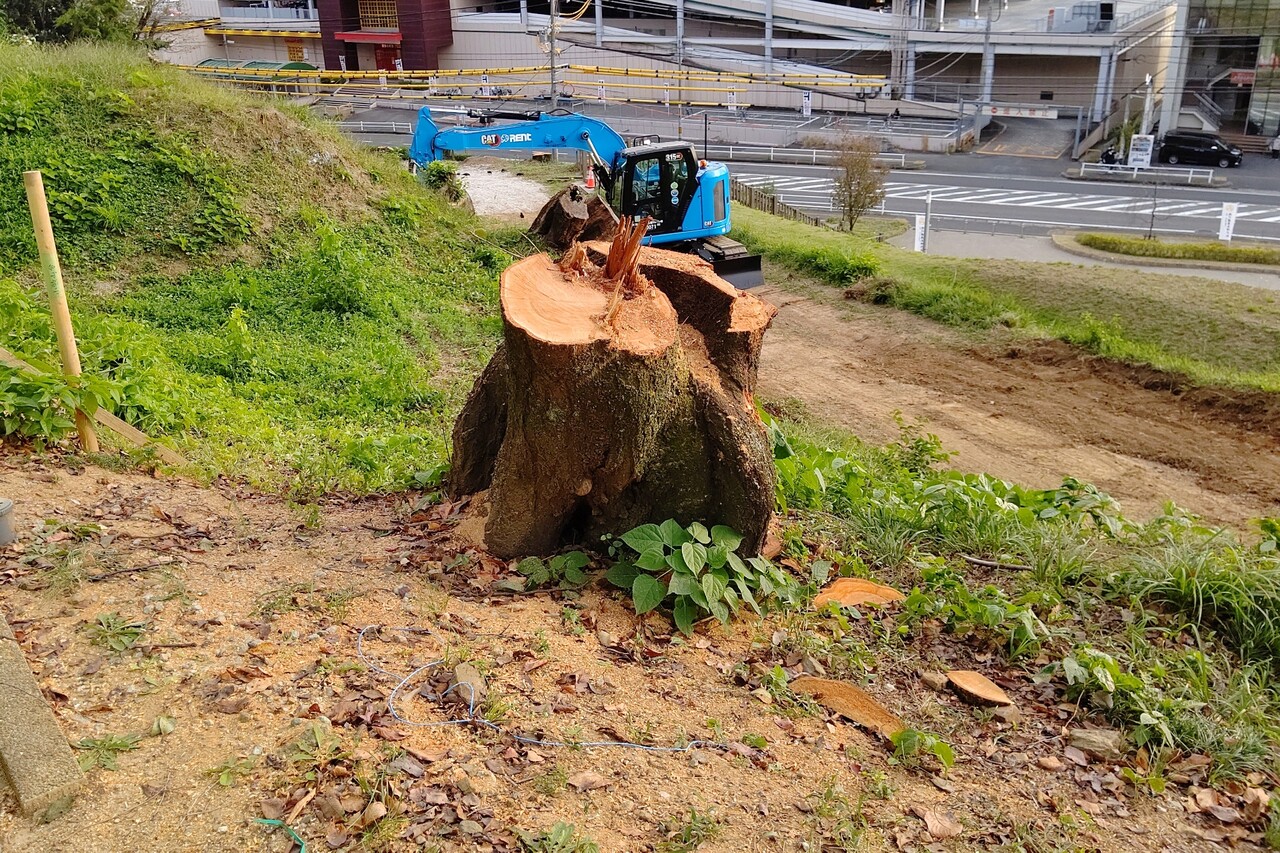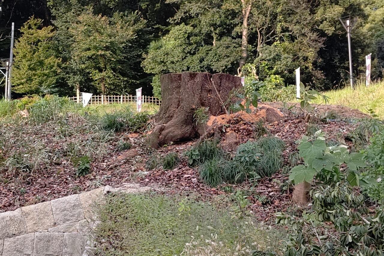 右側を見ると、結構な太さの切り株。見るからに切ったばかりという感じ。