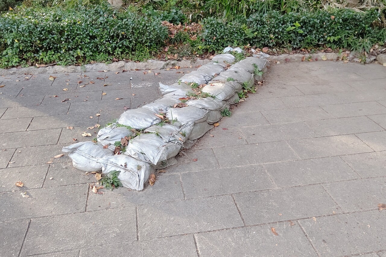 何やら工事看板がたくさんあります。桜の木がある公園のところ。