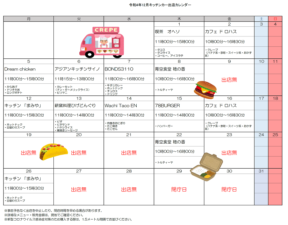『小牧市役所敷地内キッチンカー』の12月分と1月分の出店予定が出ています。
