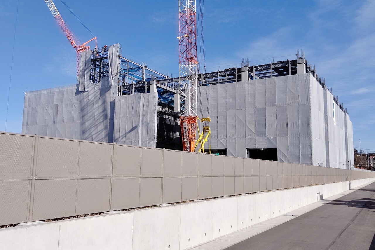 まだ骨組みを作っている段階で、大部分が灰色のシートで覆われている状態。