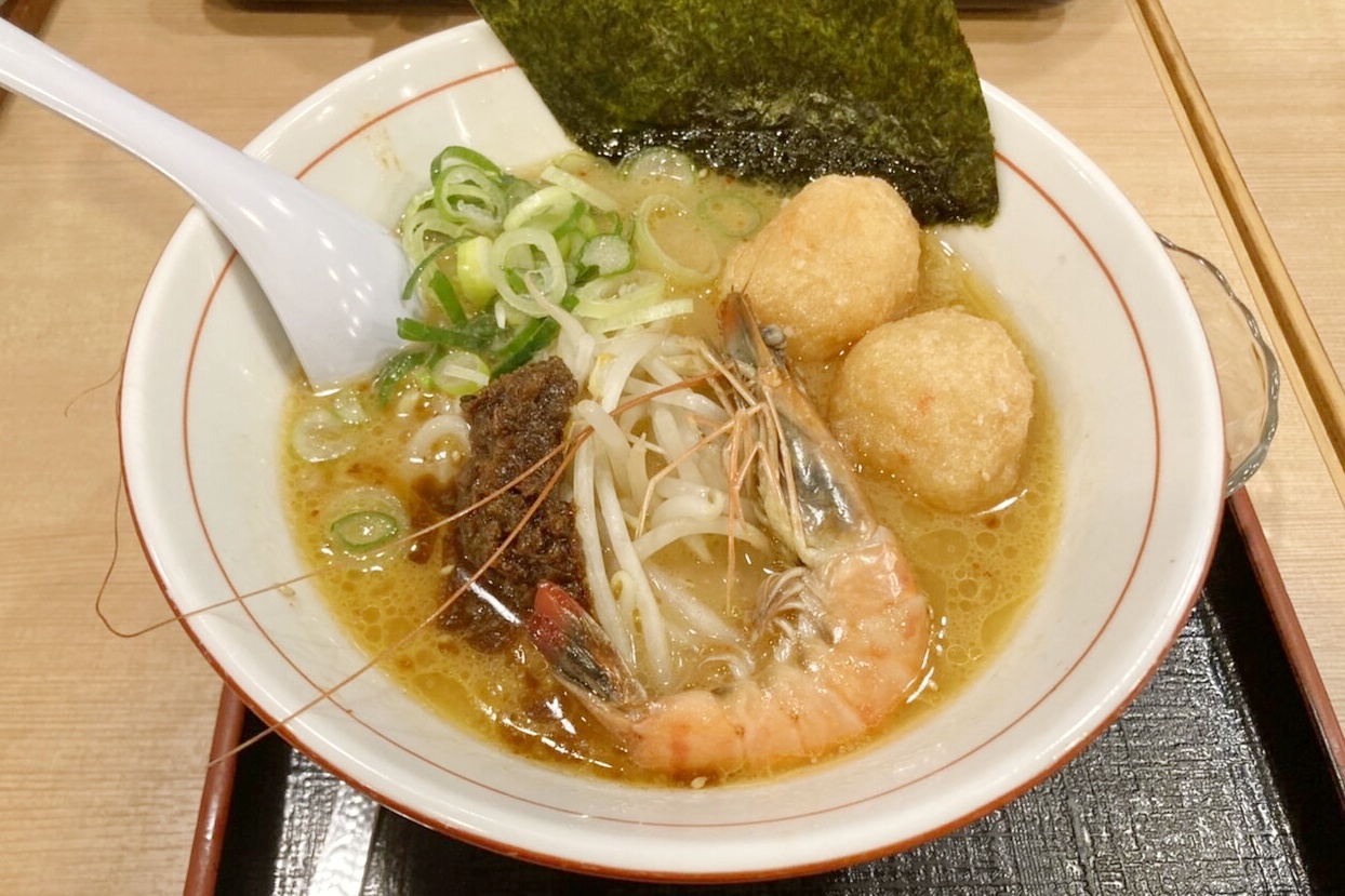 こちらは期間限定の海老味噌ラーメンです。大きな海老団子がゴロゴロ。