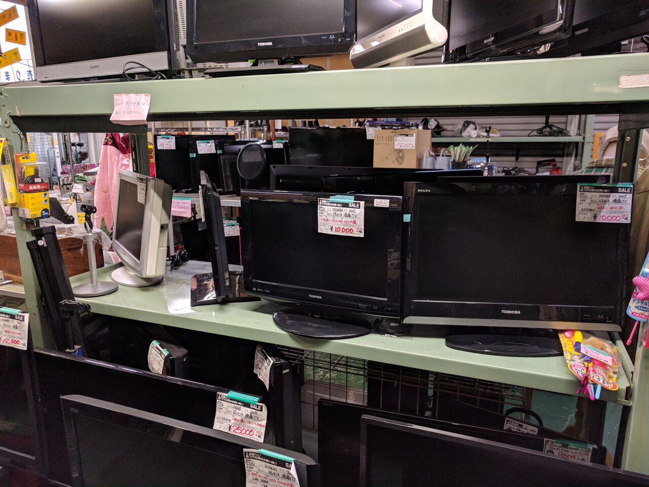 テレビがたくさん売られています。中には新しくて綺麗なテレビもありました。