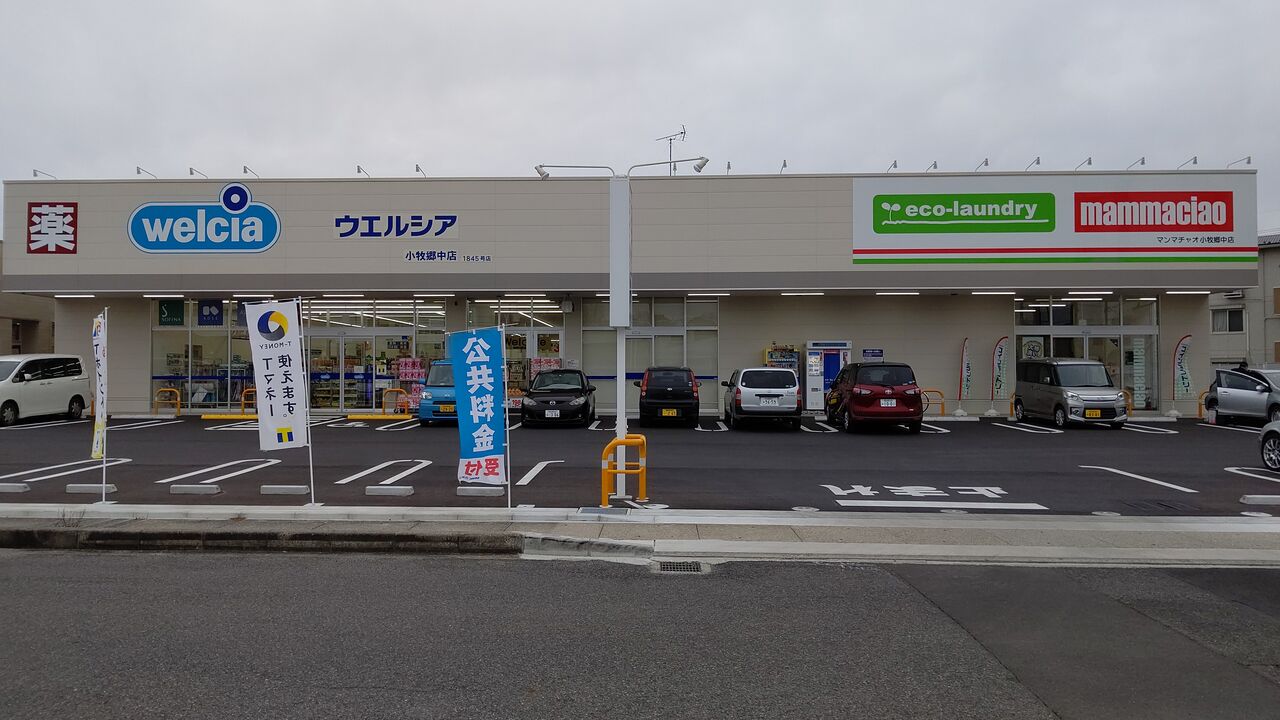 左はドラッグストアのウエルシア、右はコインランドリーのマンマチャオです。
