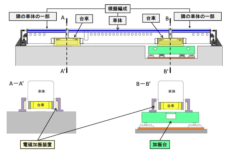 試験装置には実際の走行試験に使用していた車両が使用され、工事費は約66億円。実際に車両を走行させることなく、実物と同等の大きさ・重さの装置で模擬的に試験ができる。地上側の電磁加振装置に電流を流すことで、磁力によって車体を浮上させることができるほか、加振台で電磁加振装置等を横方向に揺らすことで、地震時や軌道のズレによって生じる車体の揺れを想定した試験が可能。