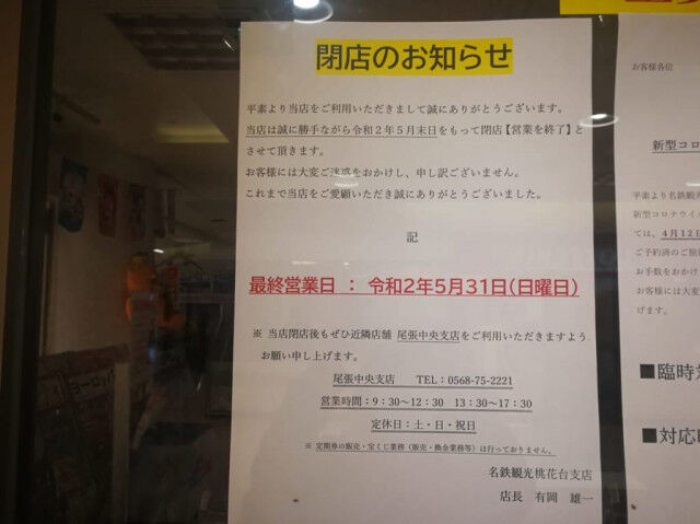 小牧市桃花台にあるMEGAドン・キホーテ UNY(旧アピタ桃花台店)の中にある名鉄観光が、新型コロナウイルスの影響で休業をしていました。