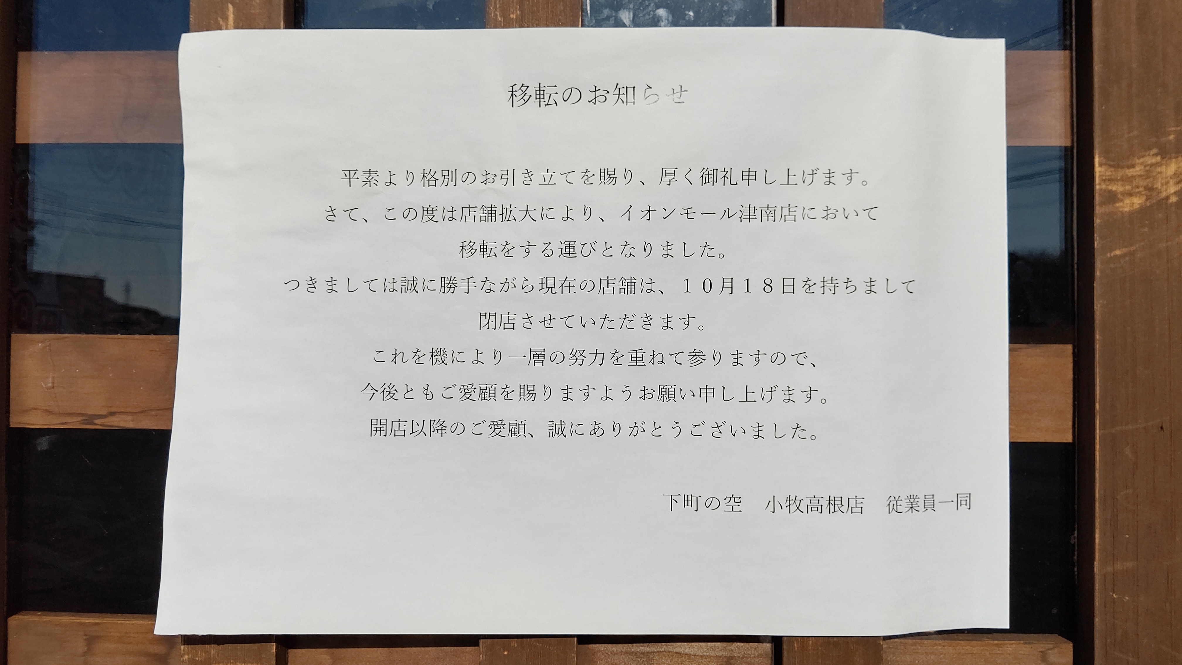 小牧市高根の「下町の空」小牧高根店が10月18日に閉店し、移転していました。