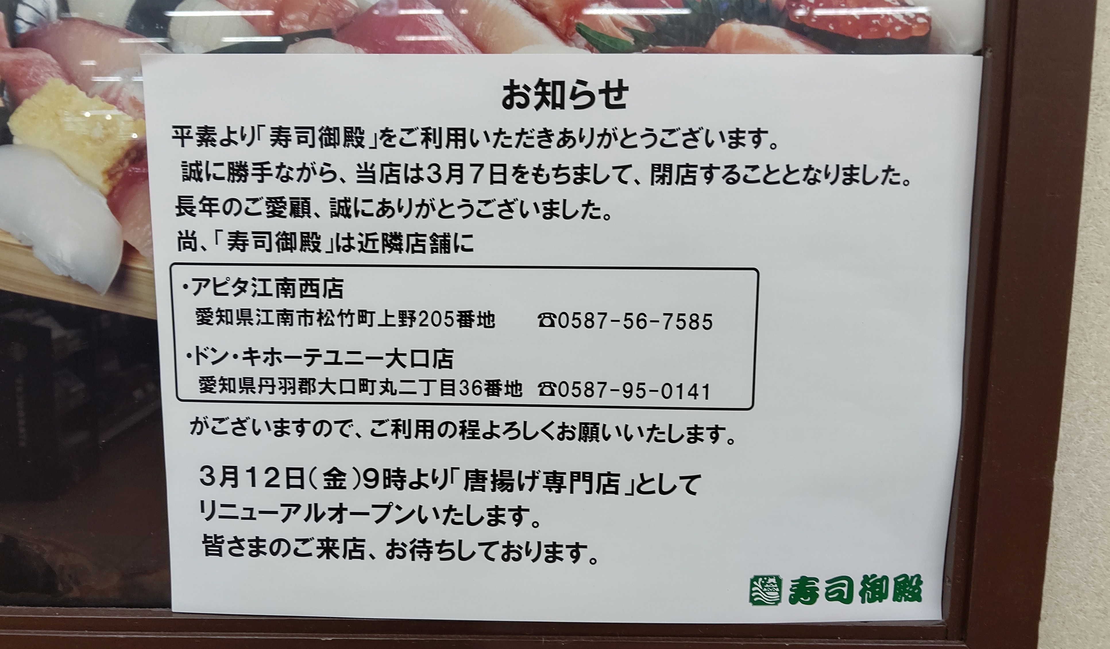 寿司御殿は近隣だと「アピタ江南西店」「ドン・キホーテユニー大口店」にあるので、寿司御殿を利用したい方はそちらでお願いしますとのこと。