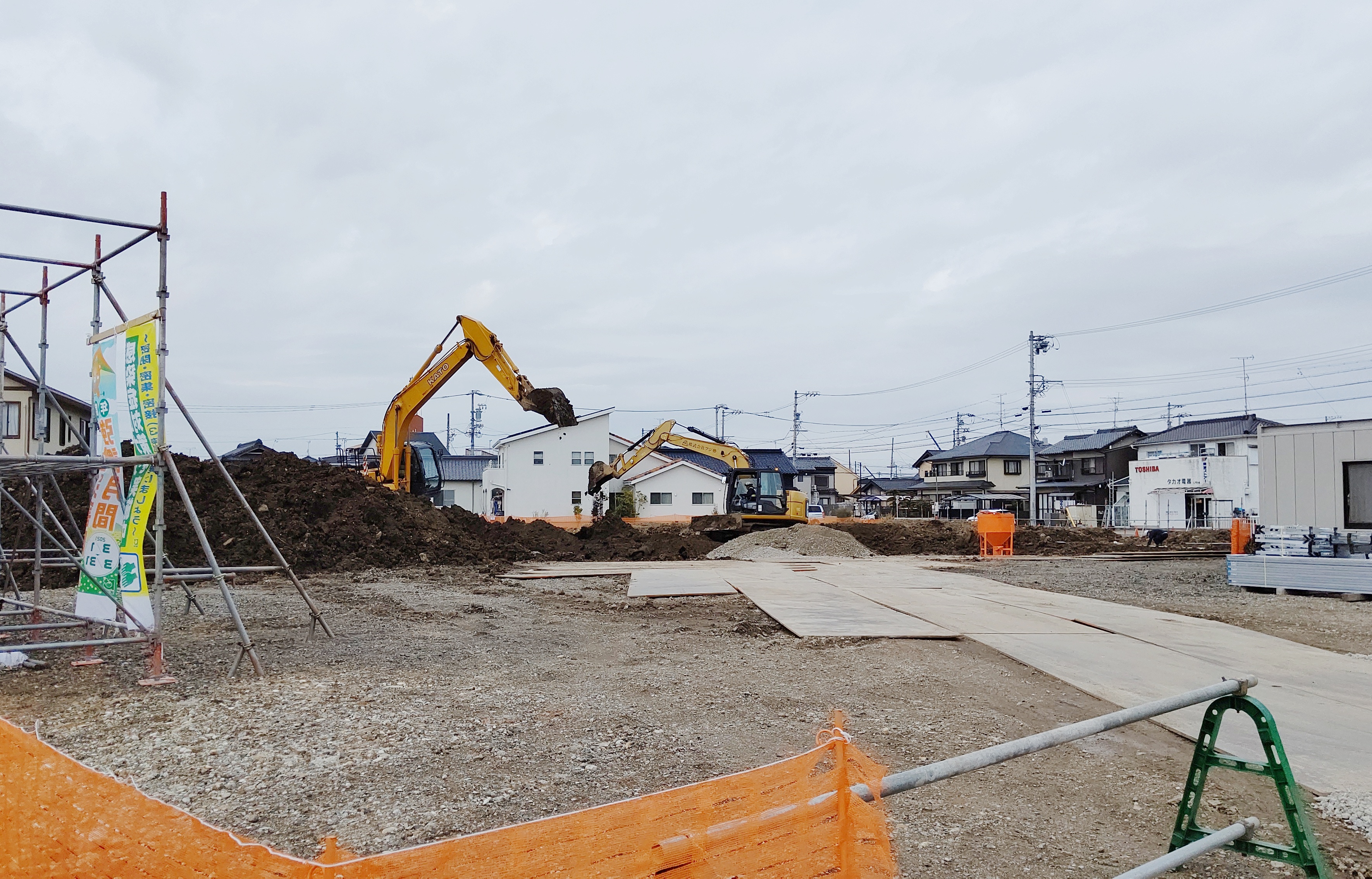 複数の重機で地盤工事をしていました。モリモリと掘り起こしています。