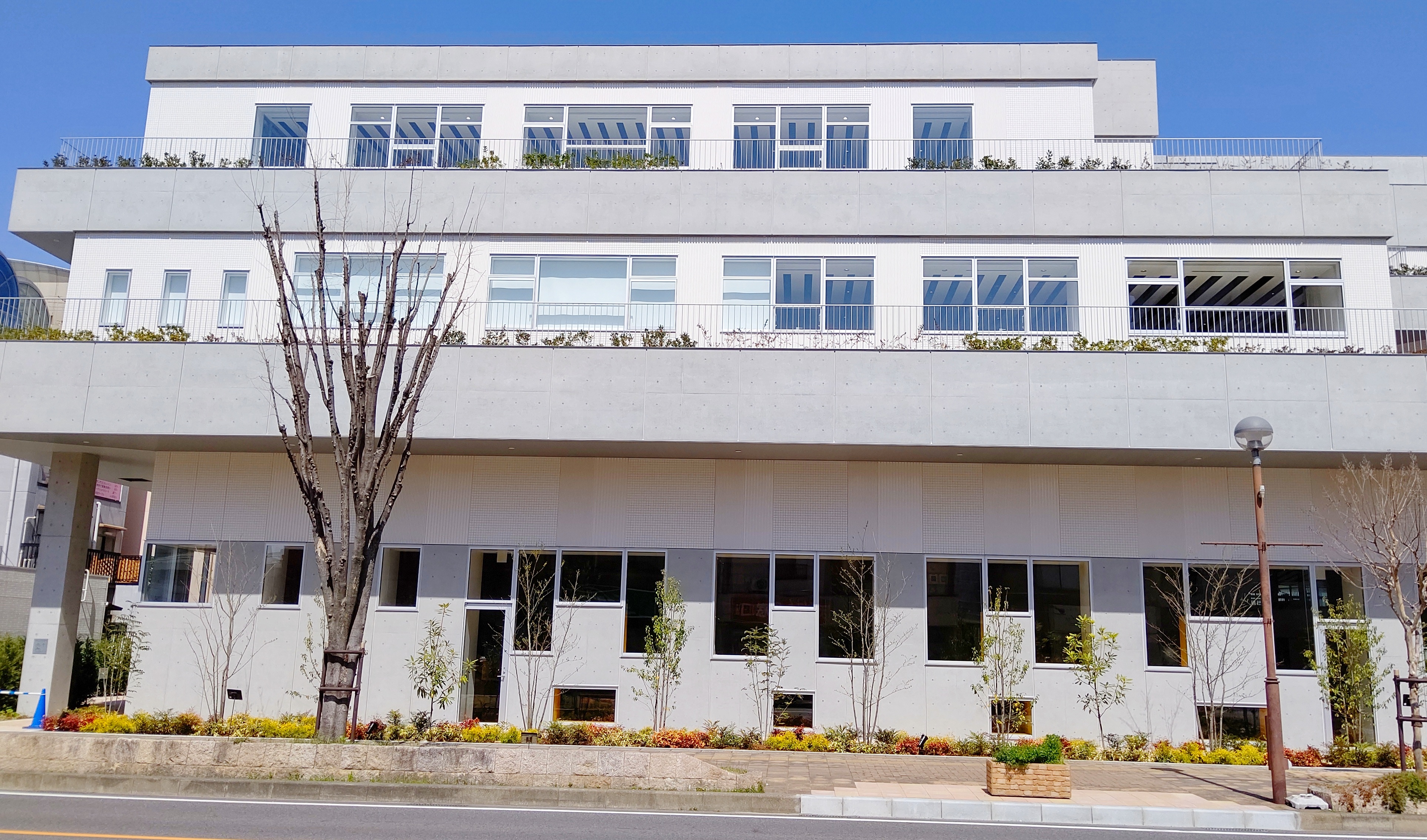 こちらは道路側から見た時の小牧市中央図書館になります。シンプルな色合いの建物になっています。