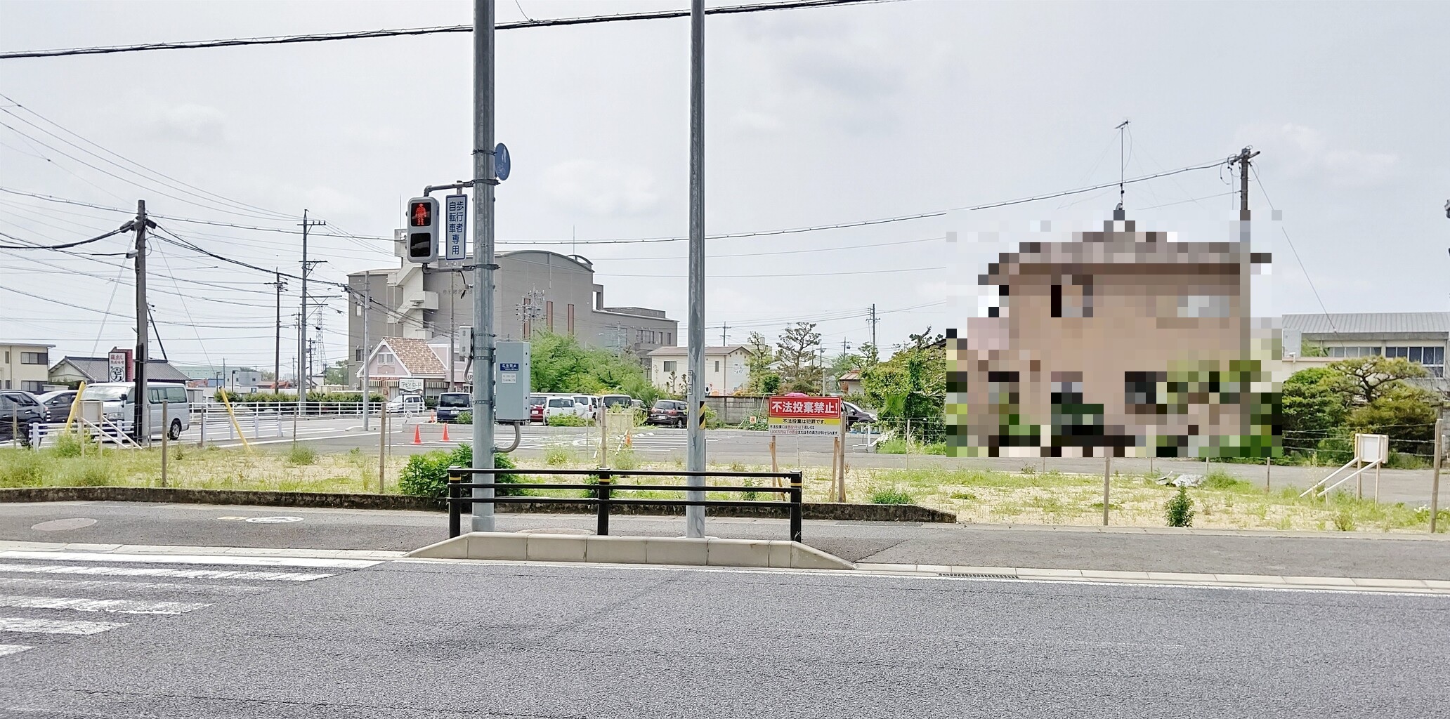 不法投棄禁止と書いてある赤い看板が立っていますね。