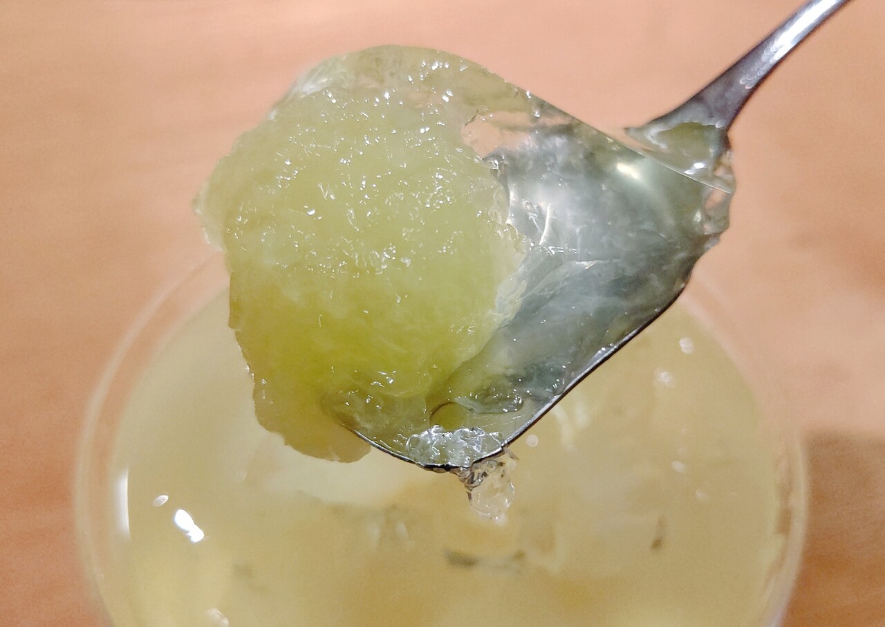 メロンの果肉とゼリーとババロアの部分を一度に一緒に口に入れると、より一層美味しくて最高。