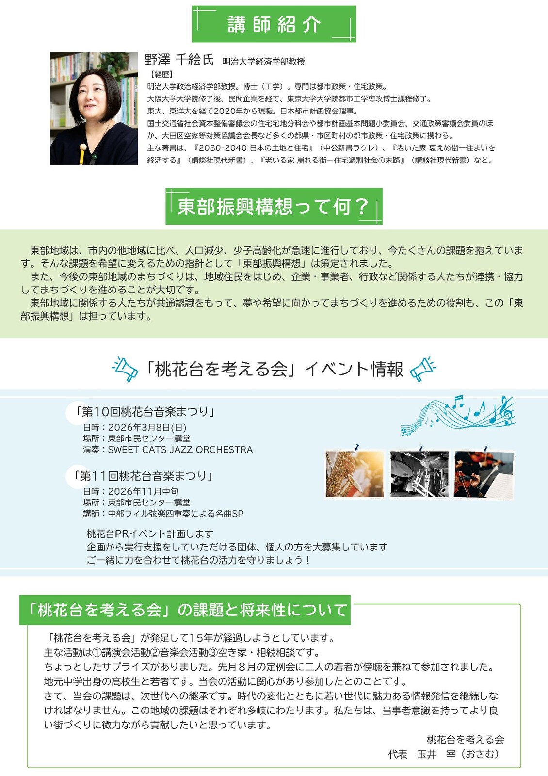 今回は「明治大学経済学部野澤教授」をお迎えして、東部地域でも課題となっている空き家について、『空き家にしないための「住まいの終活」とは~今から考える住まいとまちの未来~』といったテーマにて講演を行っていただきます。