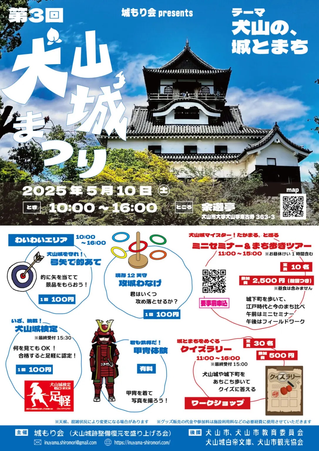 posted 2025年05月06日 『第3回 犬山城まつり』が5/10(土)10:00~16:00で開催。余遊亭にて 5/10(土)に『第3回 犬山城まつり』が開催されます。 今回が3度目となる犬山城まつり。フードコーナー、クイズラリー、遊び(輪投げ、的当て)、ワークショップ、体験コンテンツ、学び、犬山グッズの販売など。 開催日時:5/10(土)10:00~16:00 会場:余遊亭 ↓詳細はこちら ■第3回 犬山城まつり 開催日時:2025年5月10日(土)10:00~16:00 会場:余遊亭(愛知県犬山市犬山東古券363-3) 備考:駐車場無し。周辺の有料駐車場を利用 「イベント情報」カテゴリの最新記事 タグ :#犬山市#犬山城#犬山城下町#犬山城まつり#余遊亭 自才前交差点の近くで住宅型有料老人ホームの新築工事をしてる。オープン予定時期は12月(小牧市小牧原新田)地盤が出来上がった小牧市農業公園。施設整備工事は10月から(小牧市野口)