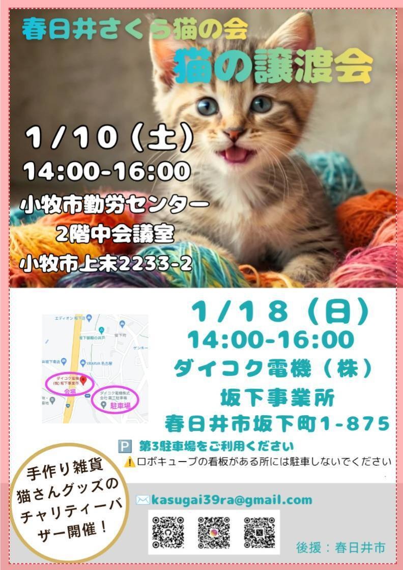 「春日井さくら猫の会」が主催する『猫の譲渡会』が1/10(土)に行われます。