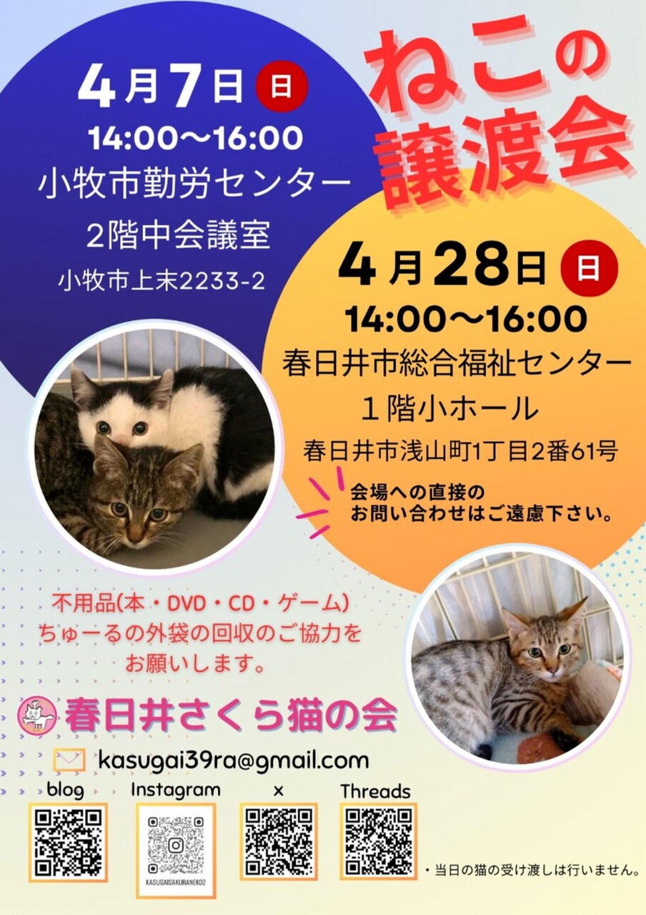 4/7(日)に「春日井さくら猫の会」が主催する『猫の譲渡会』が開催されます。会場は小牧勤労センター、時間帯は14:00~16:00。