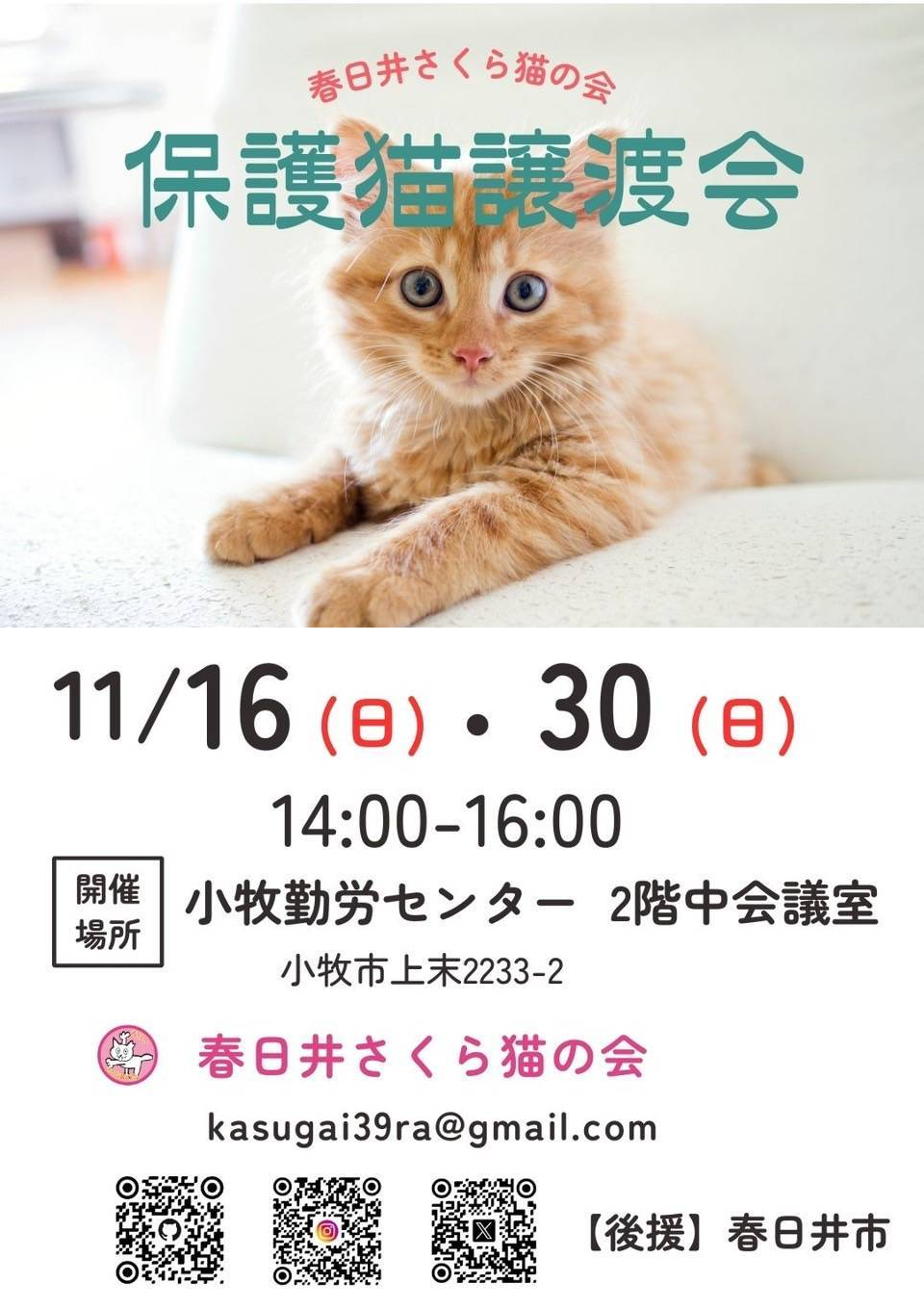 「春日井さくら猫の会」が主催する『猫の譲渡会』が11/16(日)30(日)に行われます。