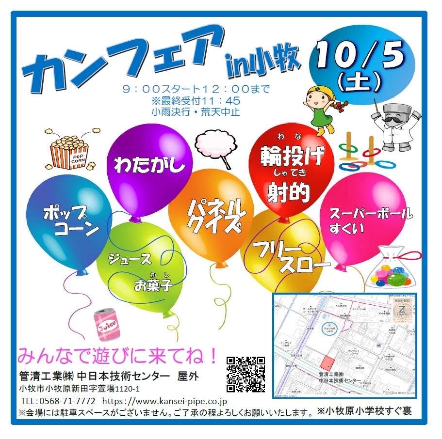 小牧市小牧原新田にある「管清工業 中日本技術センター(小牧事業所)」の敷地内で、『カンフェアin小牧』が10月5日(土)の9:00~12:00(※最終受付11:45)で開催されます。