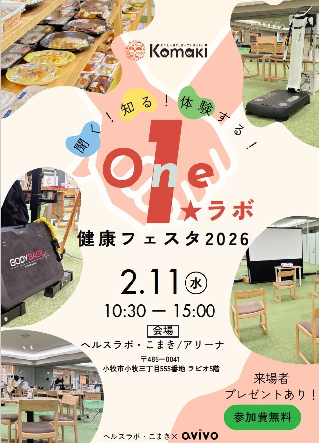ヘルスラボ・こまきは2026年1月に開設1周年を迎え、記念イベント「ONE☆ラボ 健康フェスタ2026」が2/11(水)10:30~15:00で開催されます。