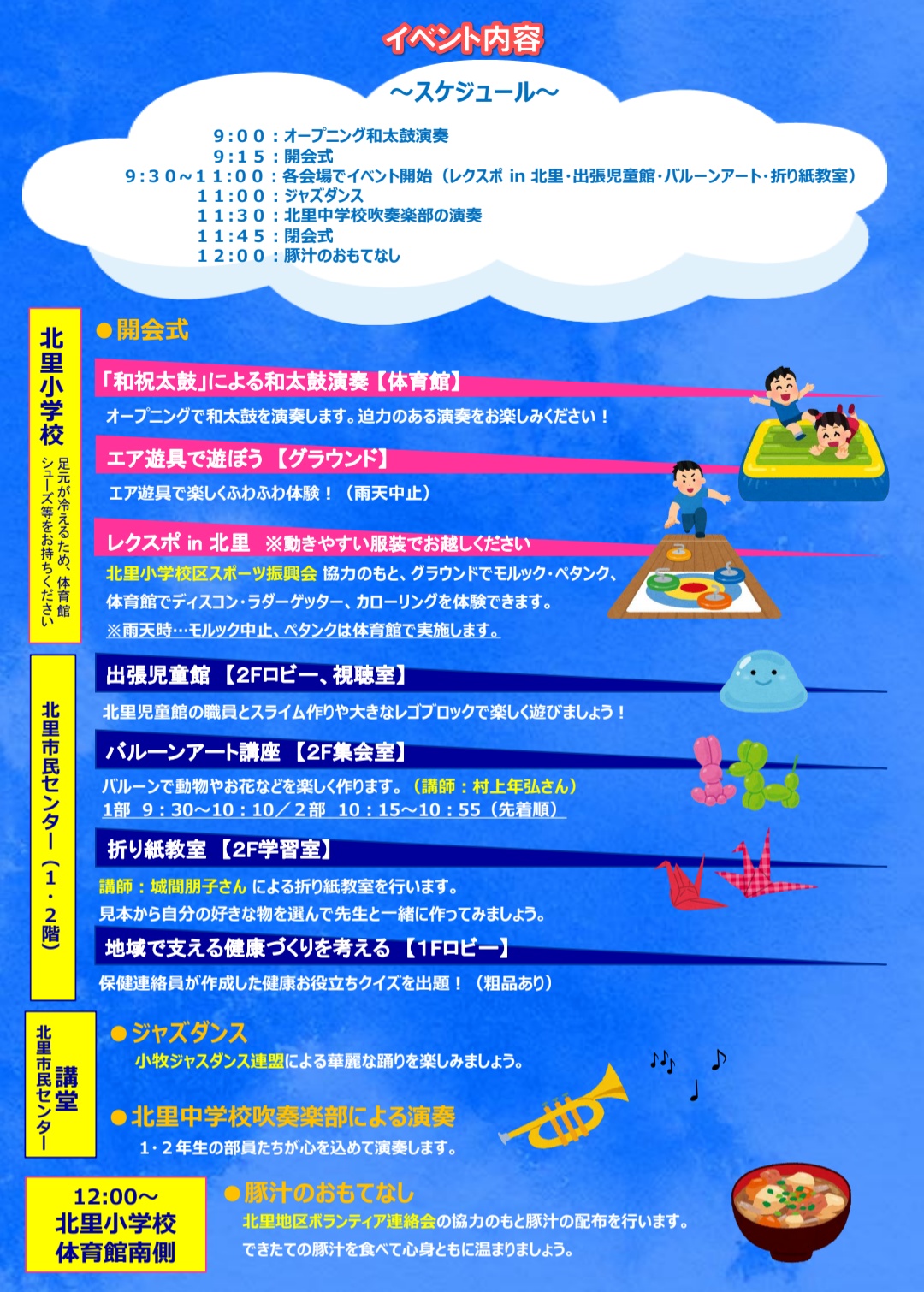北里小学校区にお住まいの方が参加対象の地区イベント。北里小学校と北里市民センターで各イベントが行われます。