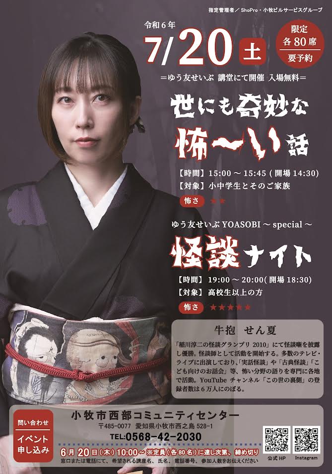 小牧市西之島のゆう友せいぶにて、7/20(土)に怖い話のイベントが開催されます。