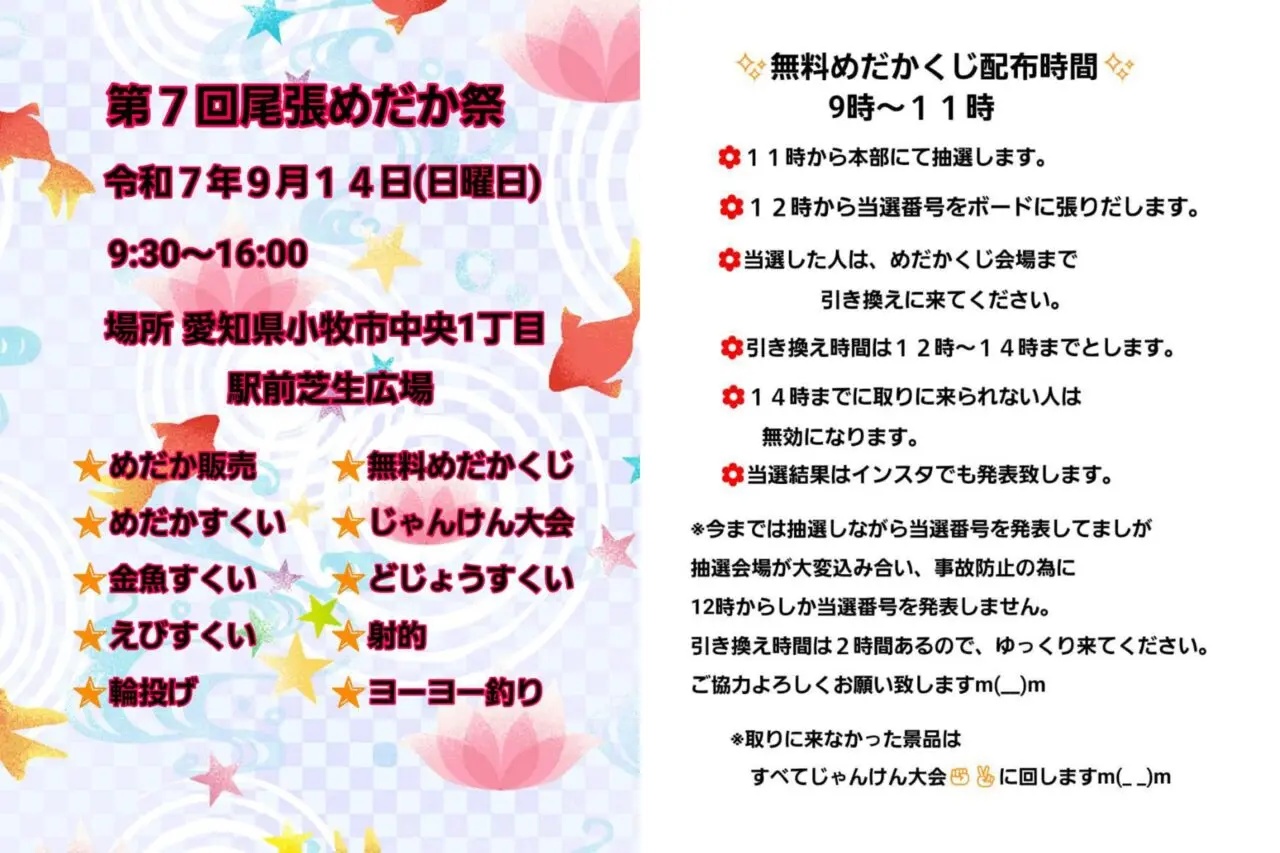 たまに開催される『尾張めだか祭』ですが、9/14(日)は小牧で開催!
