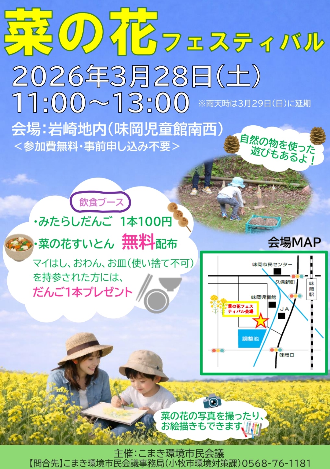 小牧市岩崎で3月28日(土曜日11:00~13:00)に『菜の花フェスティバル』が開催されます。(※雨天時は3/29(日)に延期)