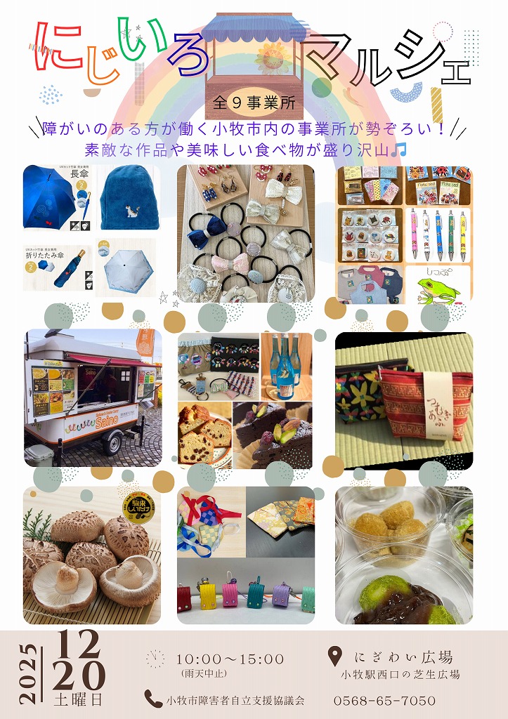 【にじいろマルシェ】主催:小牧市障害者自立支援協議会障がいのある方が日頃作られているアクセサリーや焼菓子等の販売があり、当日はキッチンカーも出店します。