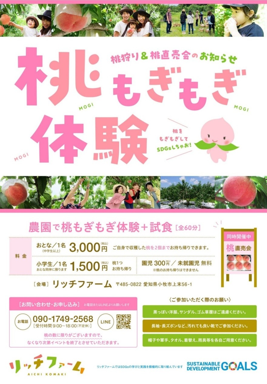 小牧市上末にある「リッチファーム」で『桃もぎもぎ体験』が始まっています。随時開催となります。