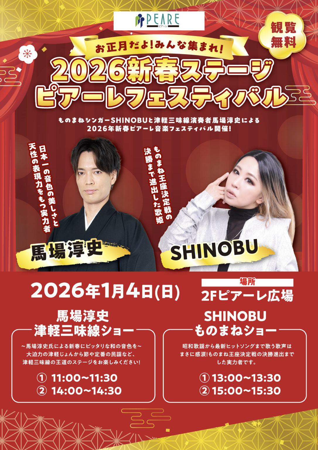 【ものまねシンガーSHINOBUと津軽三味線演奏者馬場淳史による新春ピアーレフェスティバルを開催!】