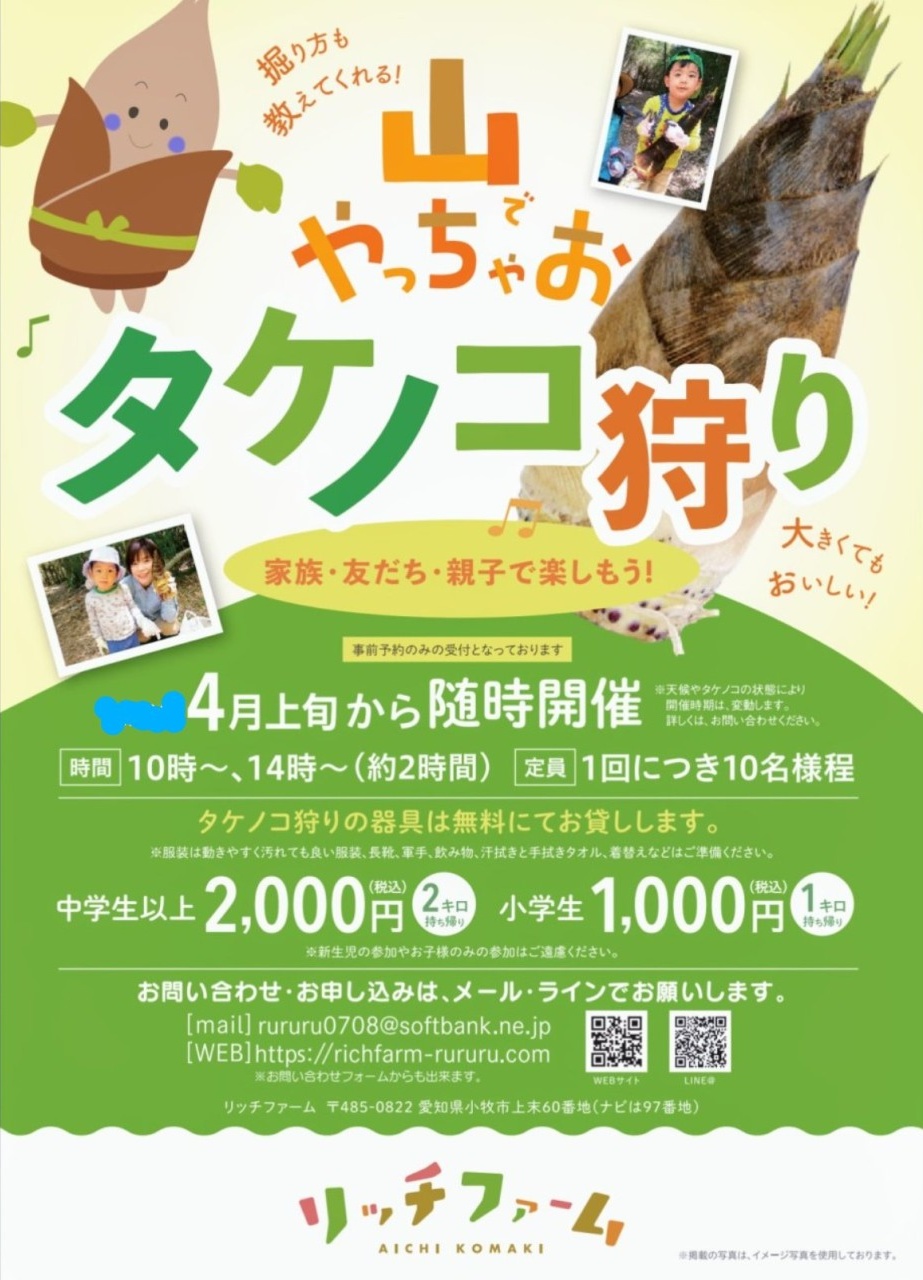 小牧市上末にある「リッチファーム」で4月上旬から『タケノコ狩り』が随時開催されるようです。