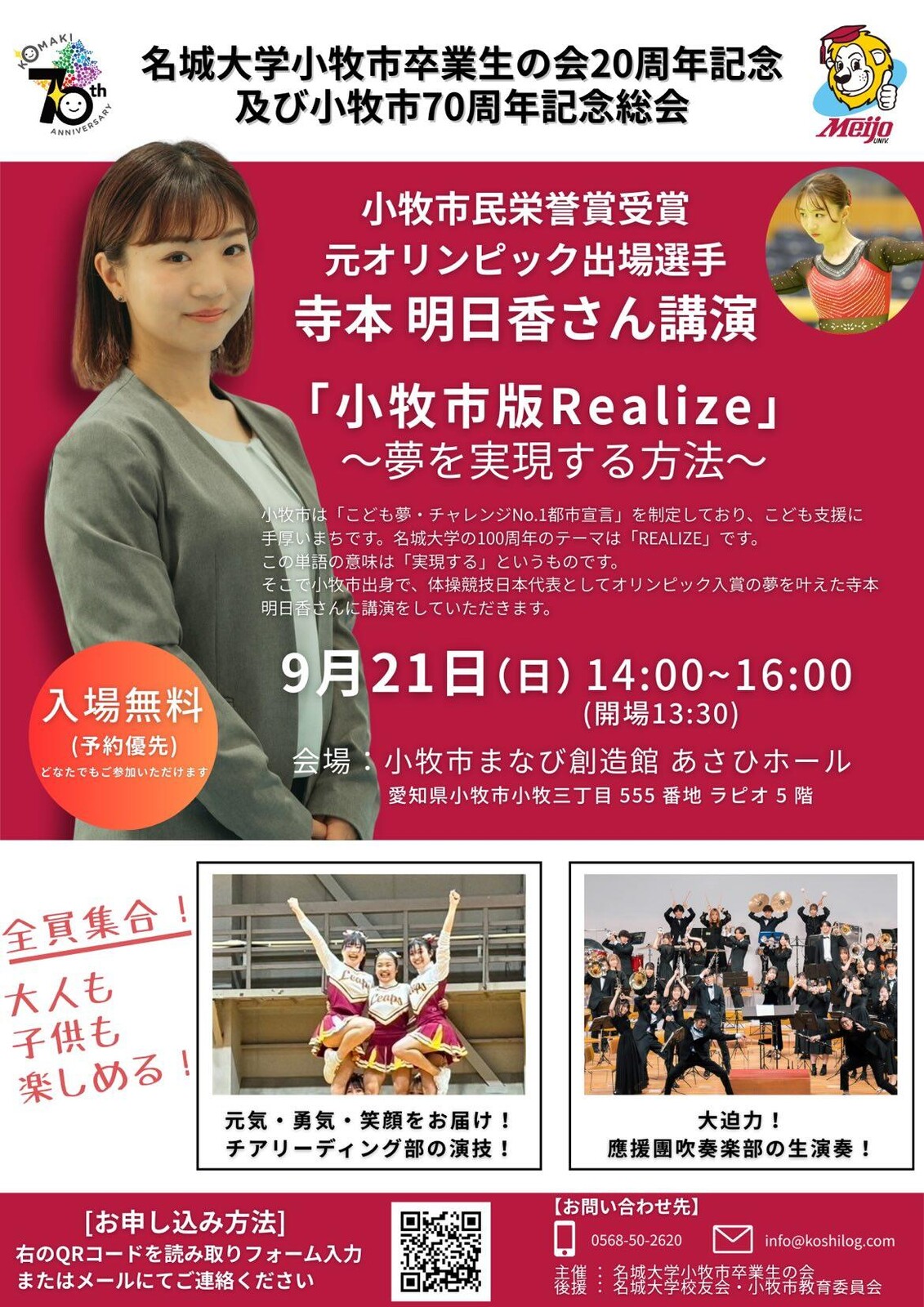 『小牧市版Realize ~夢を実現する方法~』というタイトルで、体操日本代表として2度五輪に出場した寺本明日香さんが講演します。