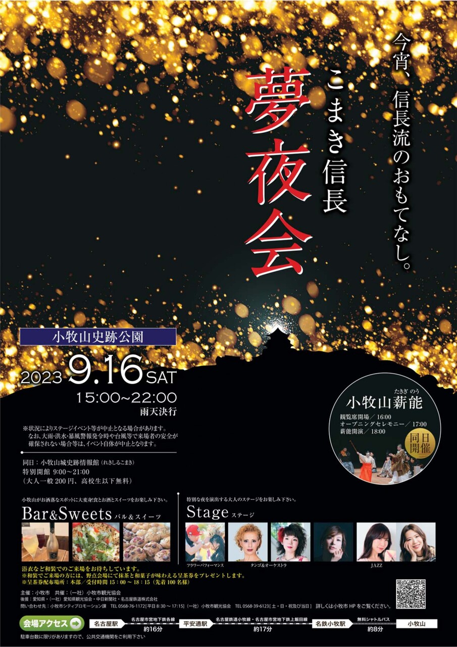 『こまき信長夢夜会2023』が9/16(土)15:00~22:00で開催されます。会場は小牧山史跡公園。