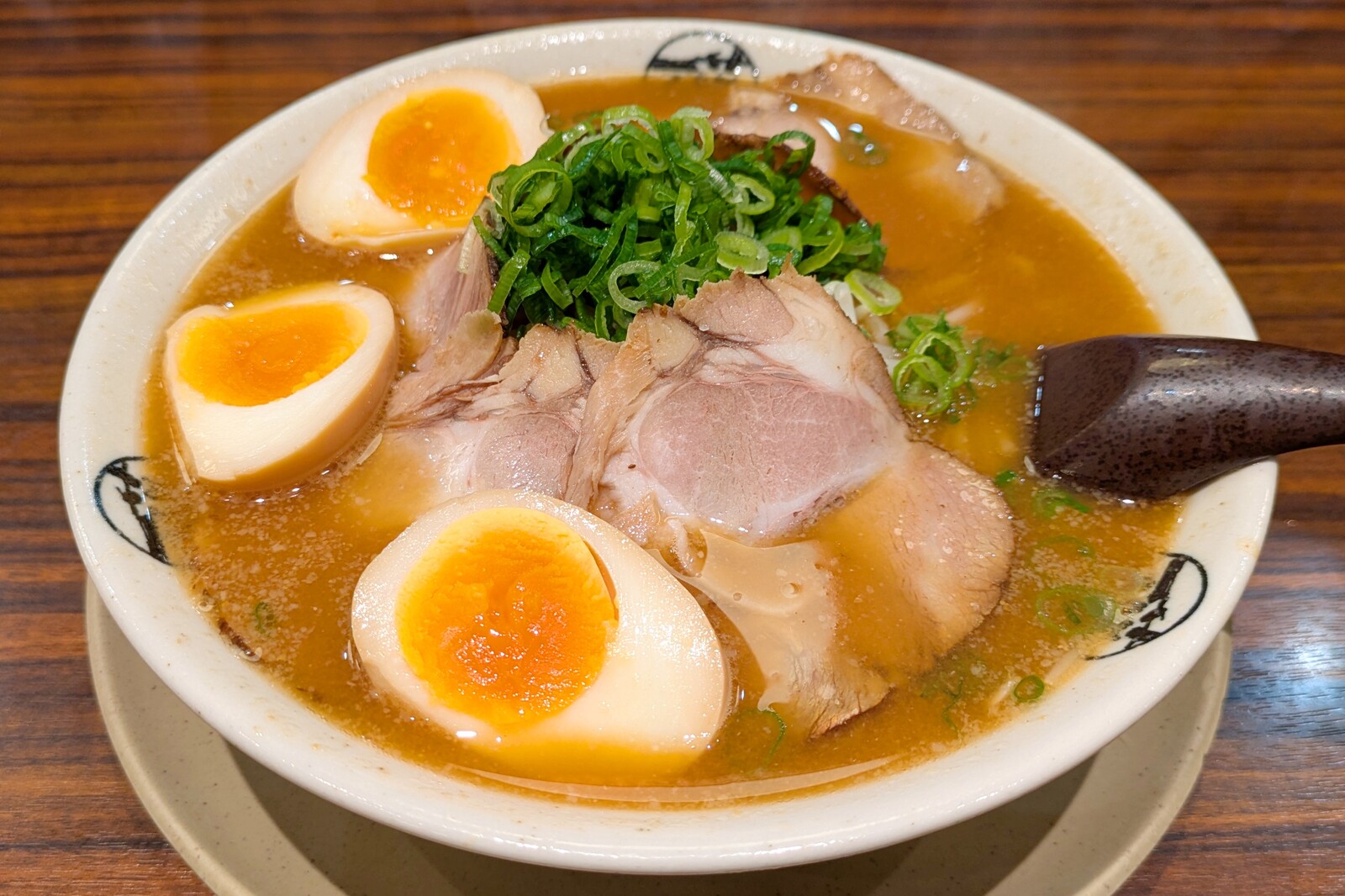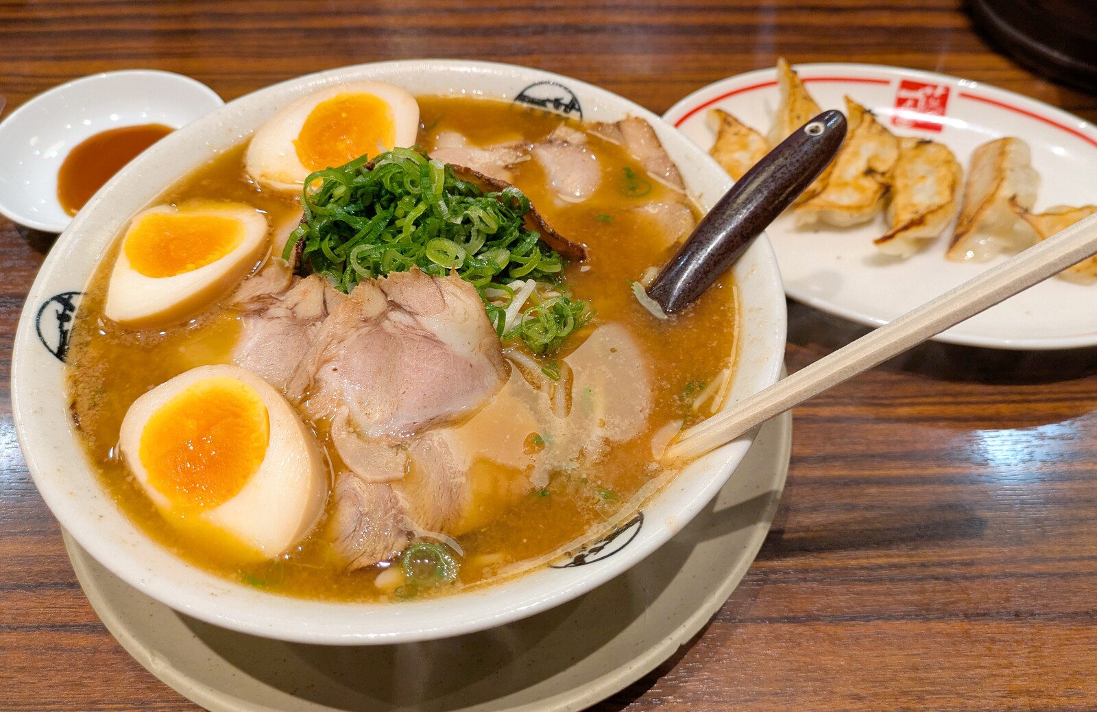来ました。味噌チャーシューめん(味玉プラス)と餃子。