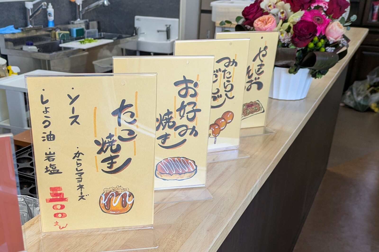 たこ焼き、お好み焼き、やきそば、みたらし団子が販売されています。