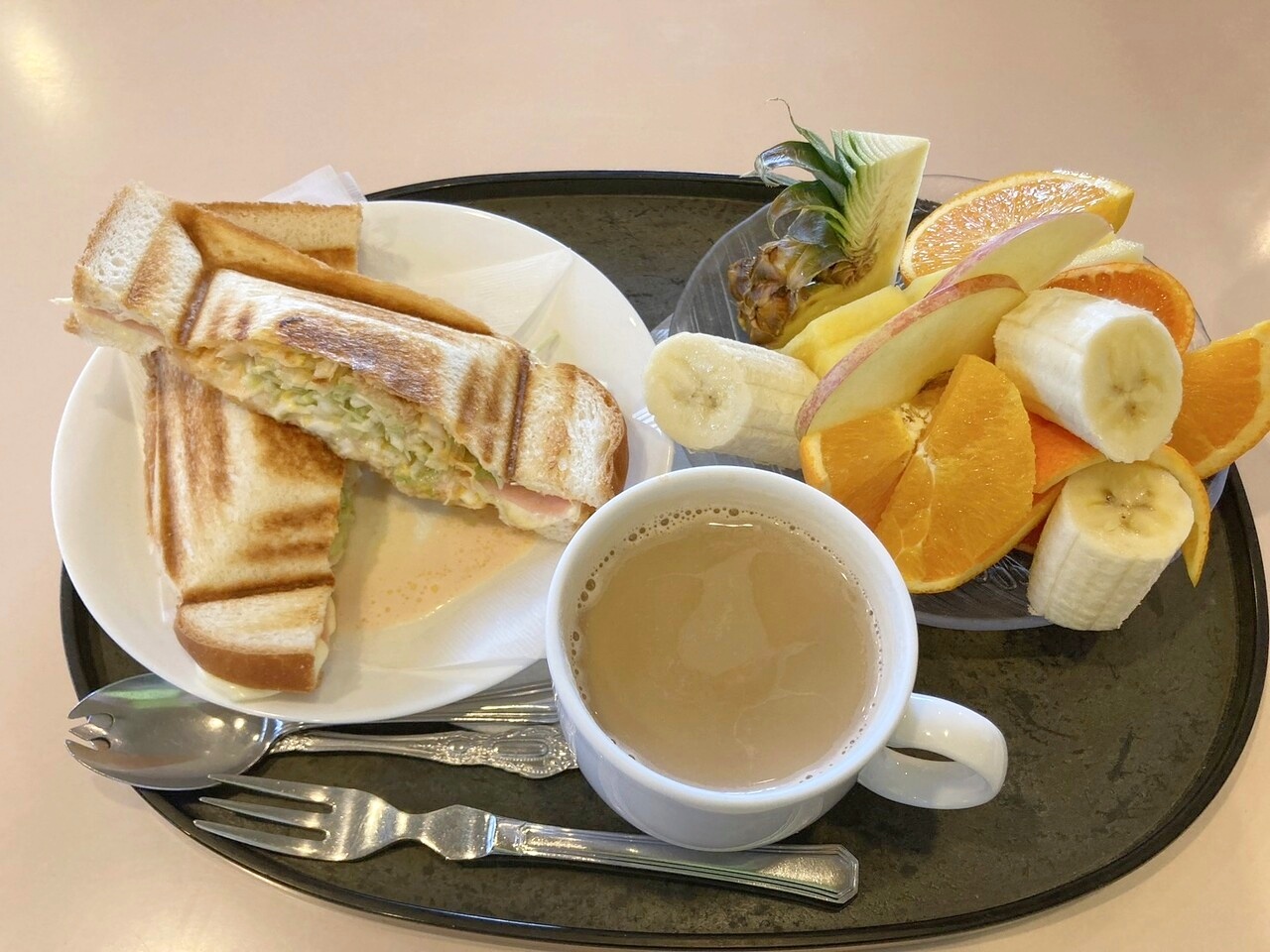 ホットサンドはハム、チーズ、卵、キャベツが入っていて食べ応えがあり、とっても美味しい。